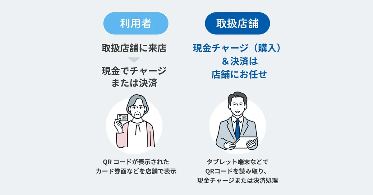 現金チャージや決済時の操作も取扱店舗が行いますので、若い方からご年配の方まで幅広い年齢層で安心かつ便利にご利用いただけます。